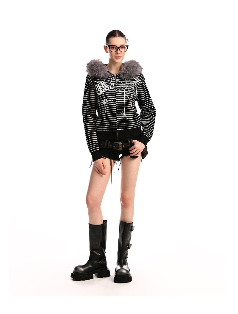 Women’s Striped Spider Web Big Fur Collar Sweater